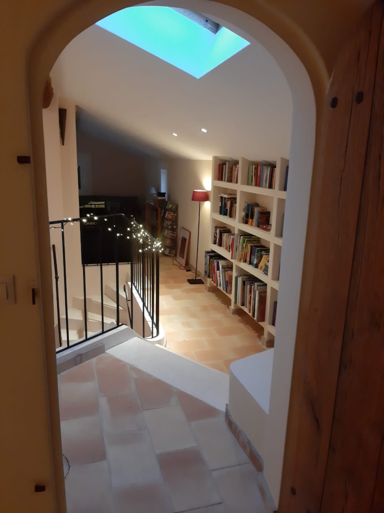 Via een open trap kom je op de mezzanine waar de bibliotheek is met veel Nederlandstalige en internationale lectuur.